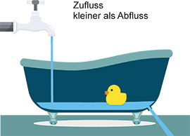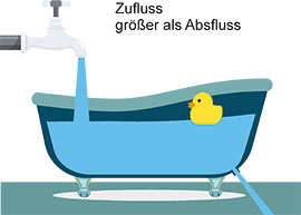 Der Zufluss aus dem Wasserhahn bleibt deutlich größer als der Abfluss. Das Wasser steigt weiter und läuft bald über den Wannenrand. Die zusätzlichen Wassermengen überfluten die Lahnufer.